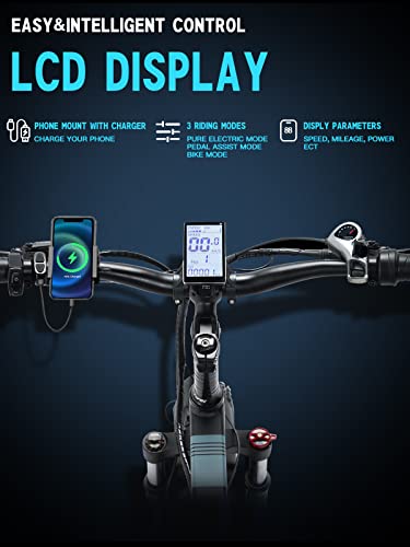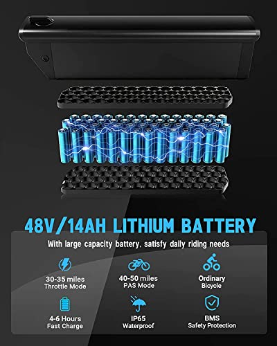 - LONG-RANGE BATTERY: The folding ebike comes with a 48V 14Ah removable large-capacity lithium-ion battery, which can achieve 30 miles in pure electric mode and 50 miles in pedal assist mode. BMS security protection and power-saving. With 3 riding modes (electric bikes & assisted bike & normal bike) and 5 levels of pedal assist, easy to enjoy a short trip