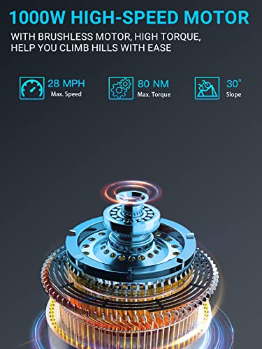 - 1000W ELECTRIC BIKE: The e bikes for adults electric is built with a 1000W brushless hub motor, 80NM of torque provides strong climbing power, max speed reaches up to 28MPH and conquers 30° hill with ease. Non-slip 20''x4.0 all-terrain fat tire bike applicable to all terrains, you can get excellent riding experience in snow, beach, mountain and city road