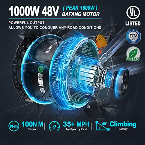 - 【1600W PEAK BAFANG MOTOR】Equipped with BAFANG high-speed rear hub motor and a high performance controller, FREESKY electric bike offers 100N·m climbing power. Ebike for adult top speed reaching up 35+MPH by pedal; 20 MPH by throttle. E bike motor certified by UL, Rohs TüV. You can get excellent riding experience in the snow, beach, mountain, city road.