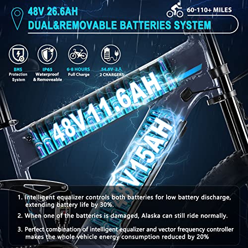 - 【LONG RANGE EXPERT-DUAL BATTERIES】DUAL removable lithium batteries (Upper battery is 11.6 Ah and Down battery is 15Ah), even if one battery is broken or out of power, Alaska can still run normally. Compared with single battery, dual batteries maximize ebike range and extend their life beyond average. Featured with 6 hours’ charging, it can achieve 60-110 miles’ comprehensive mileage(Aileage range varies according to road condition, riding mode, weather, rider's weight etc).