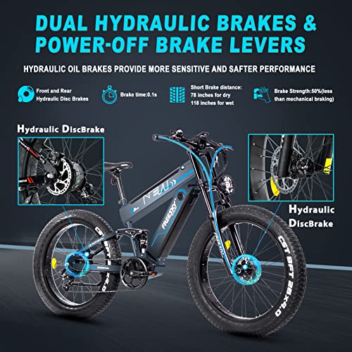 - 【FULL SUSPENSION & HYDRAULIC DISC BRAKES】FREESKY adult electric bike adopts lockable and adjustable front suspension hydraulic downhill fork and rear suspension which greatly reduces unnecessary bumps during riding. In rainy weather, heavy off-road, long downhill and adverse conditions, provides more effective braking with dual, front and rear hydraulic disc brakes. Both offer you safer and comfortable riding experience.